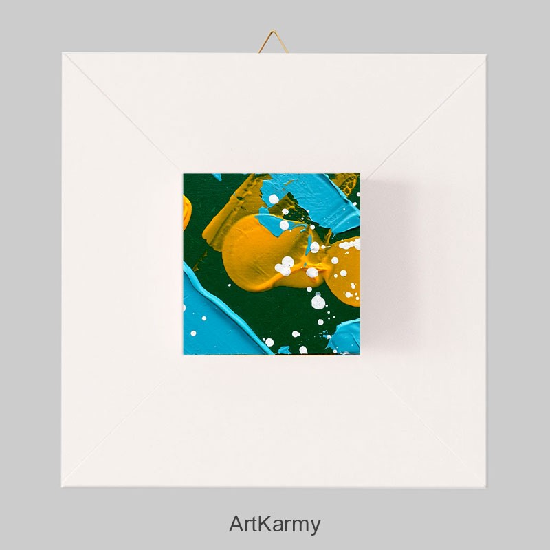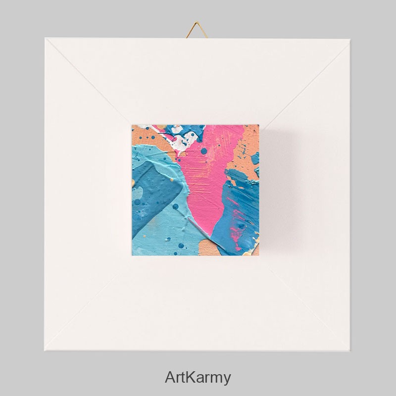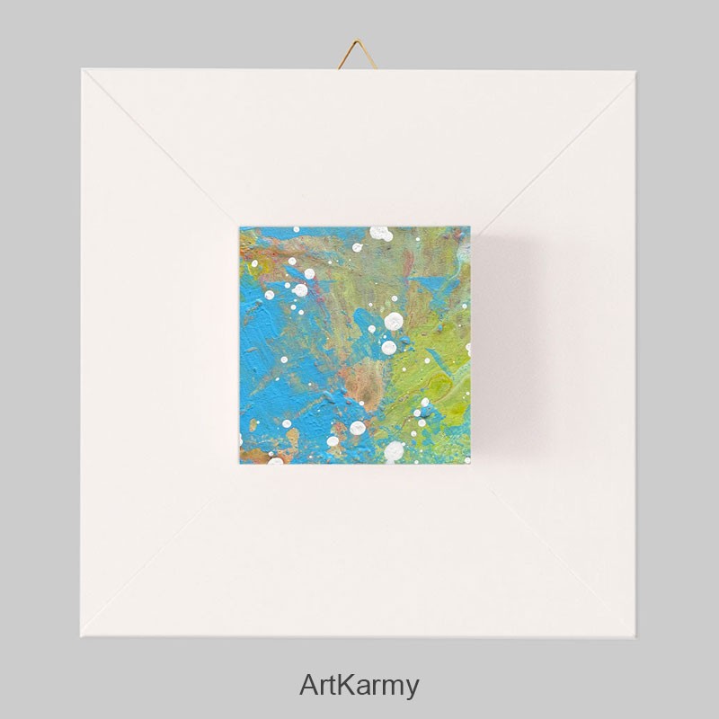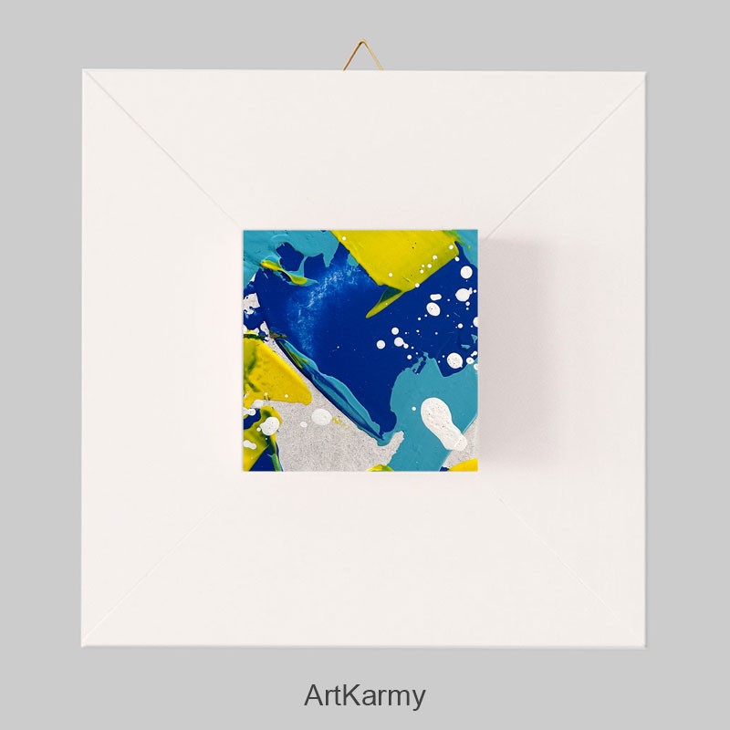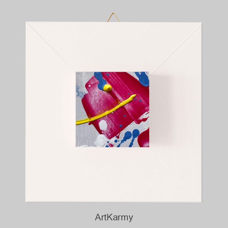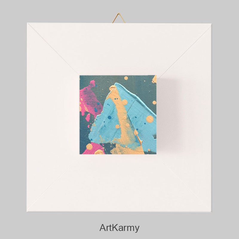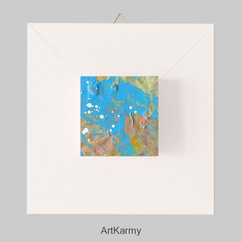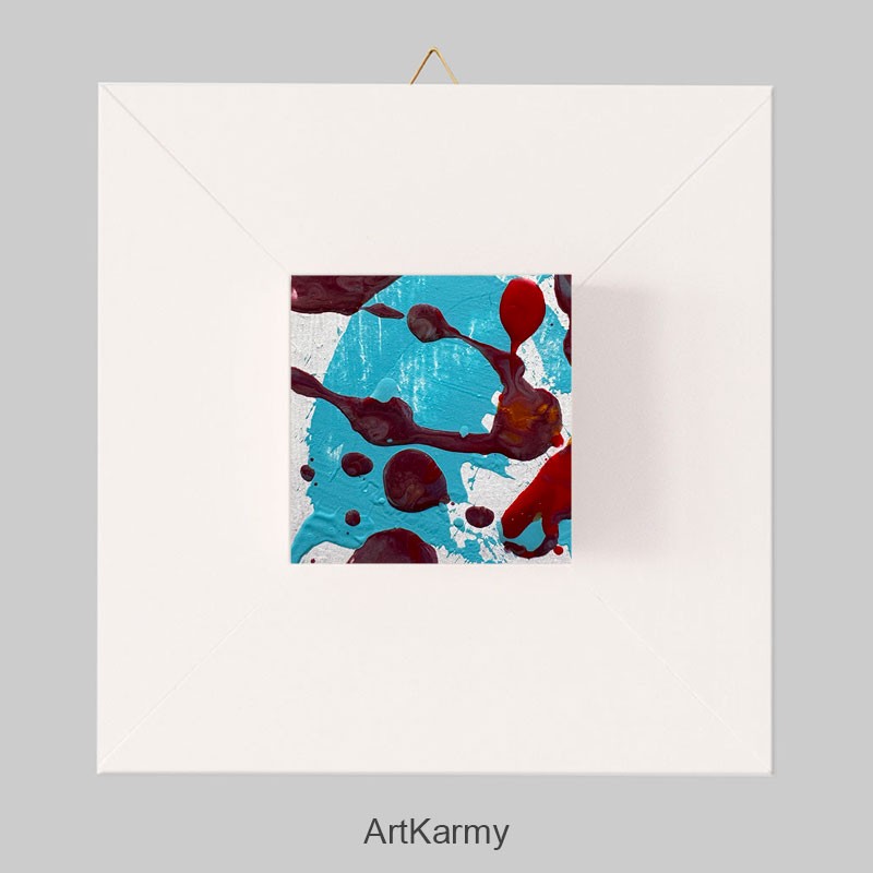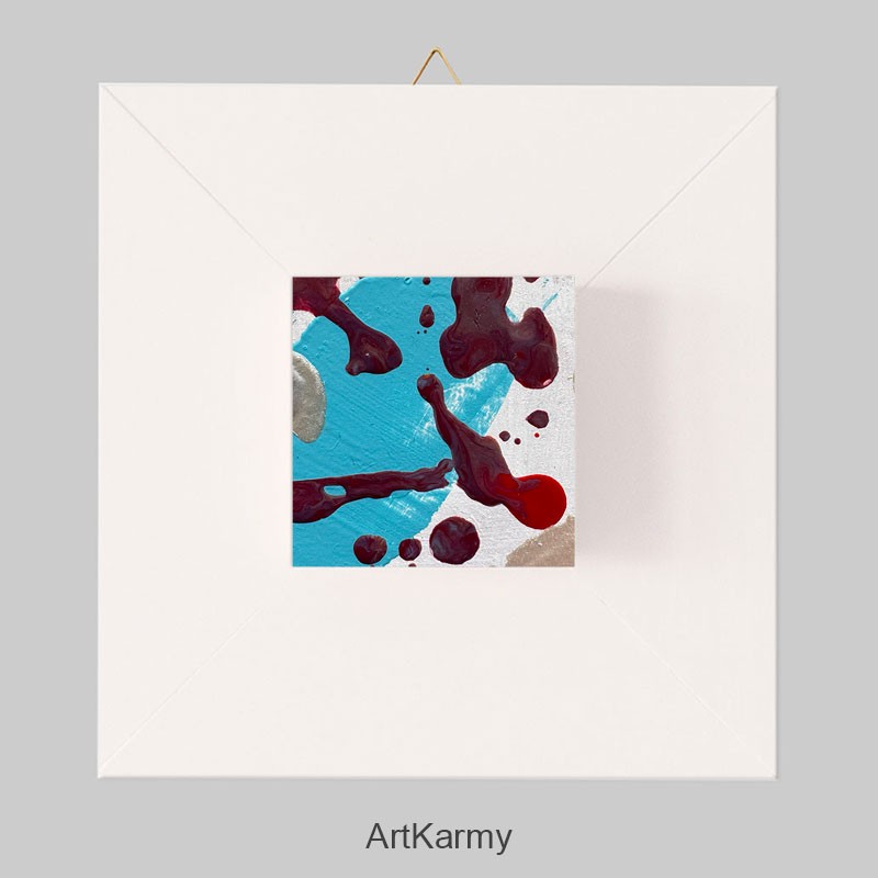 Realizzate su supporto in legno 5 x 5 cm, racchiuse in una cornice bianca in legno dipinta a mano, raggiungono una dimensione totale di 12 x 12 cm. I quadretti sono realizzati con la tecnica mista astratto materica.