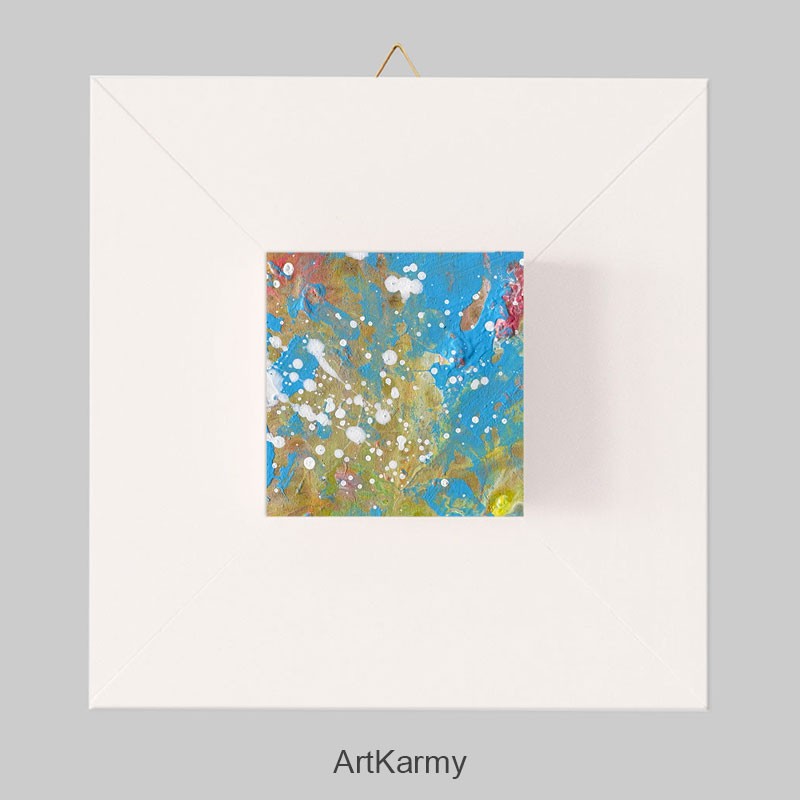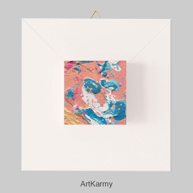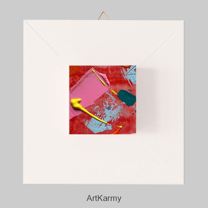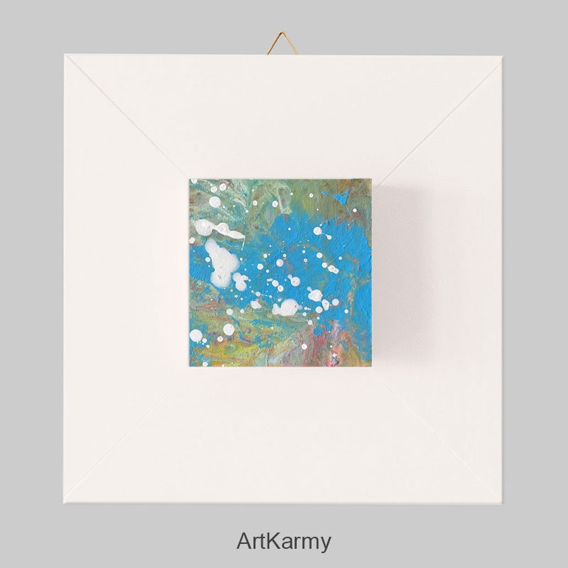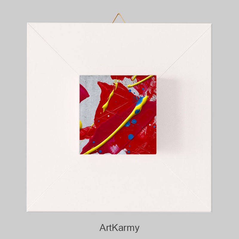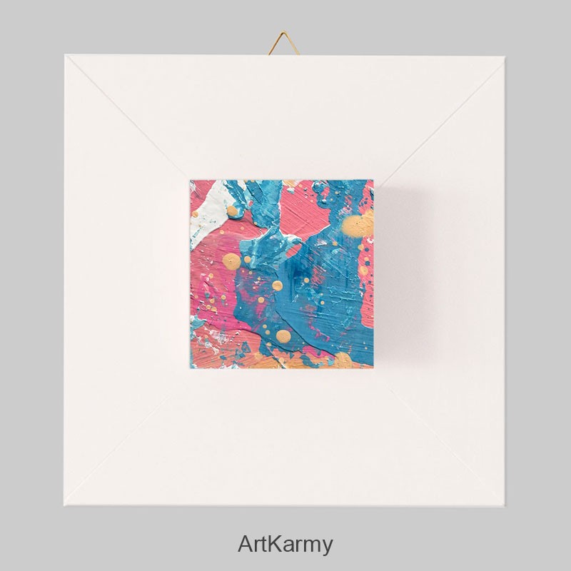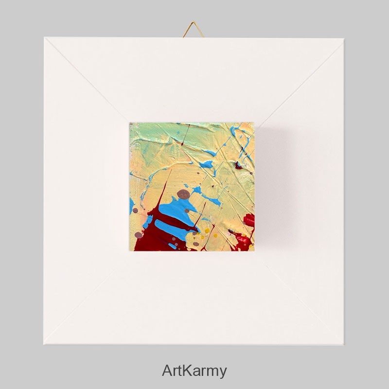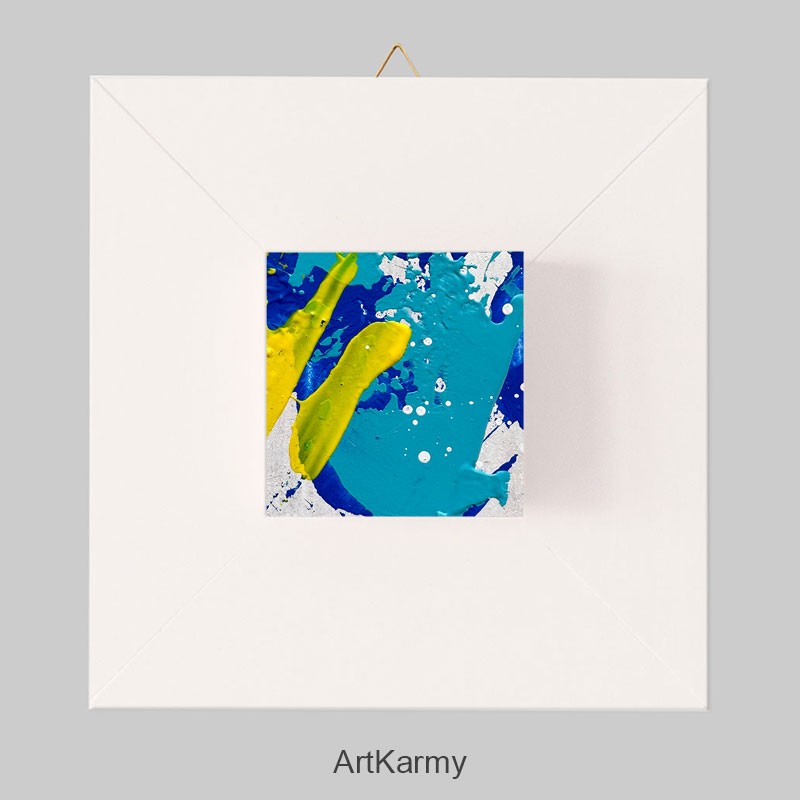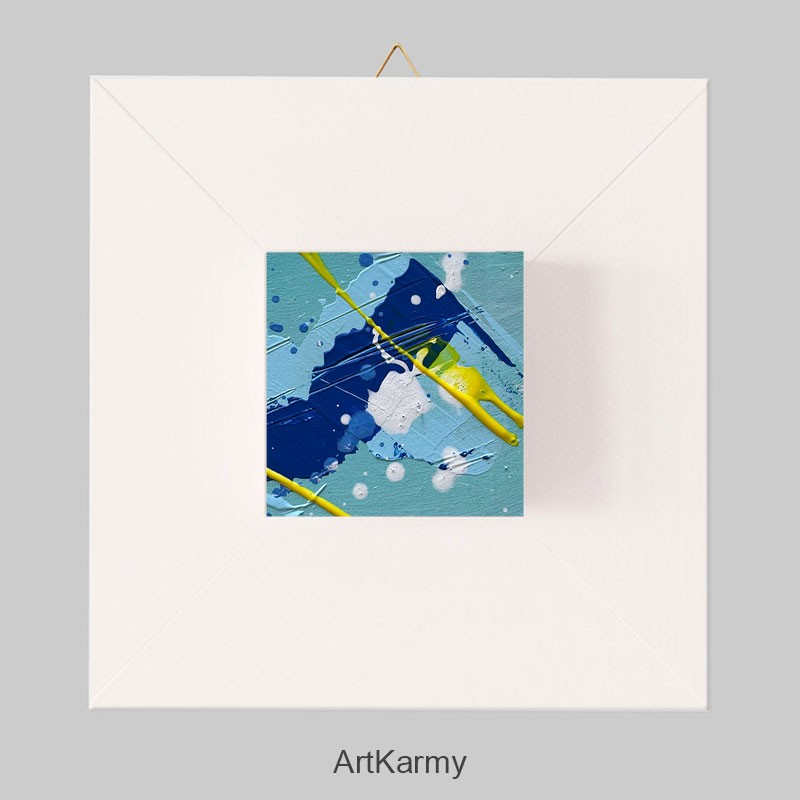 Realizzate su supporto in legno 5 x 5 cm, racchiuse in una cornice bianca in legno dipinta a mano, raggiungono una dimensione totale di 12 x 12 cm. I quadretti sono realizzati con la tecnica mista astratto materica.