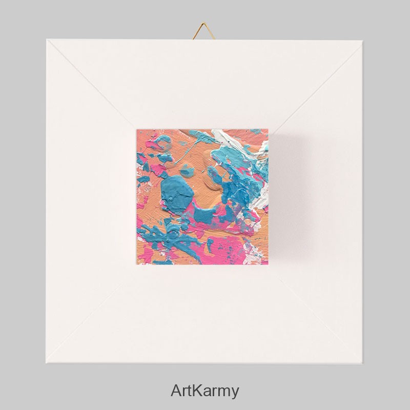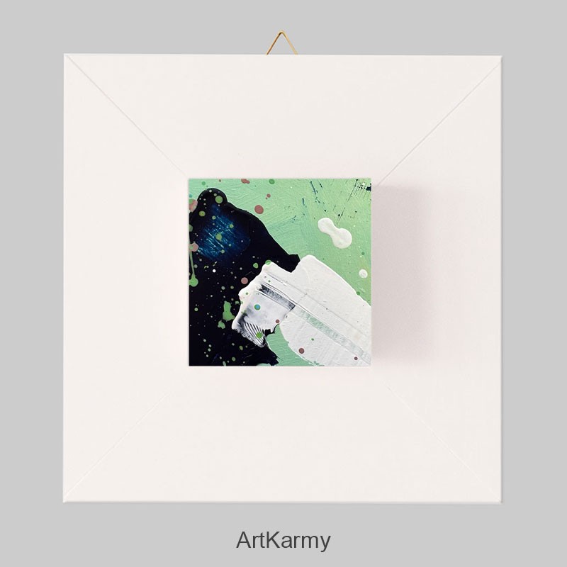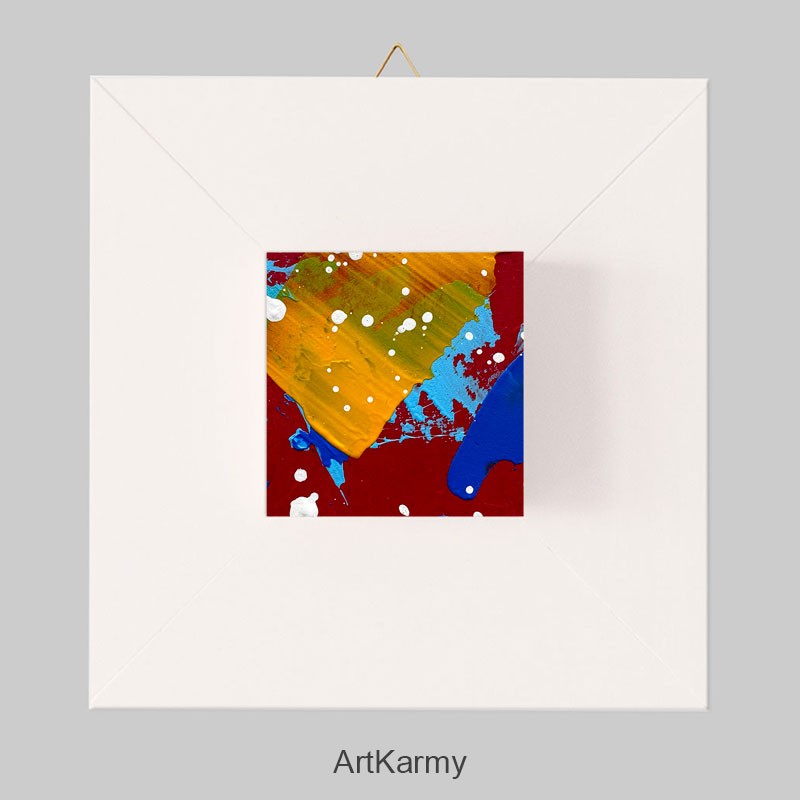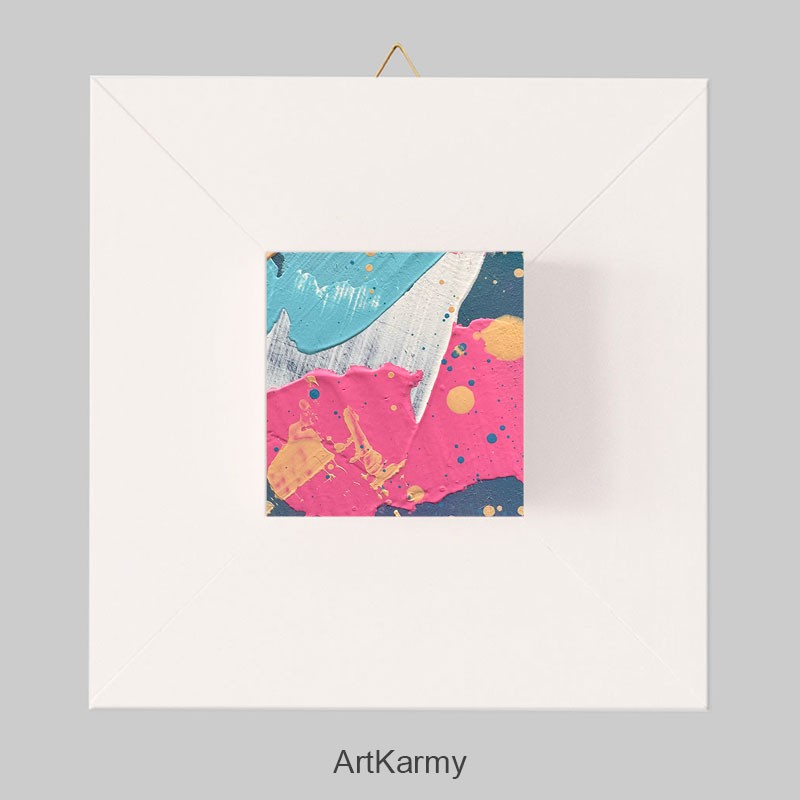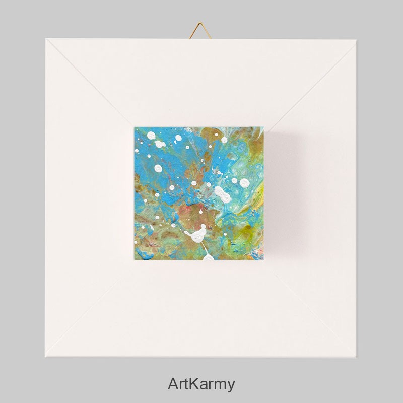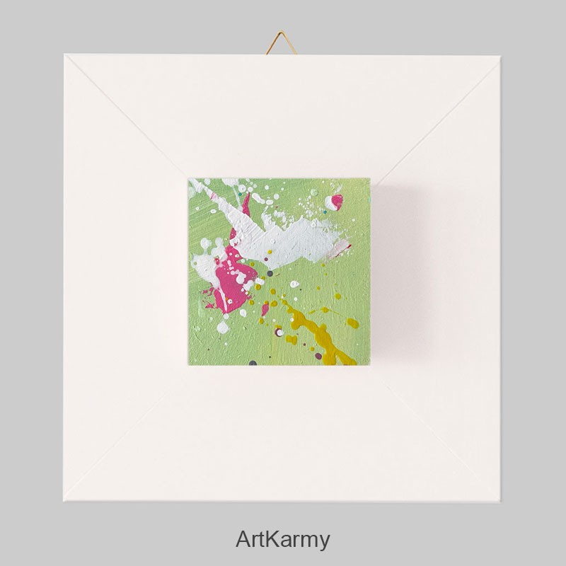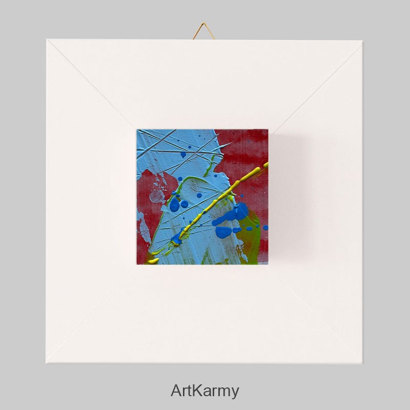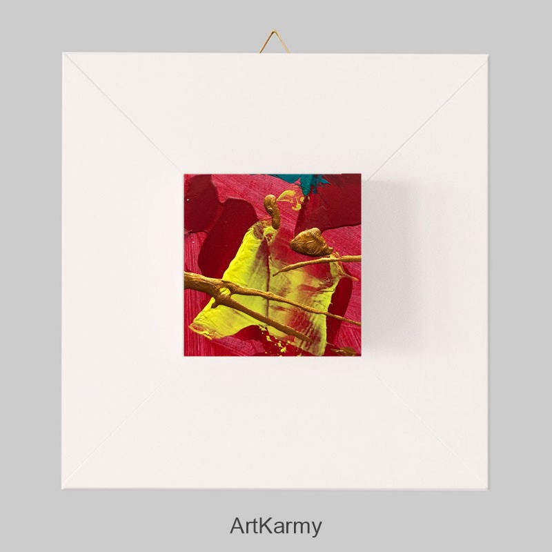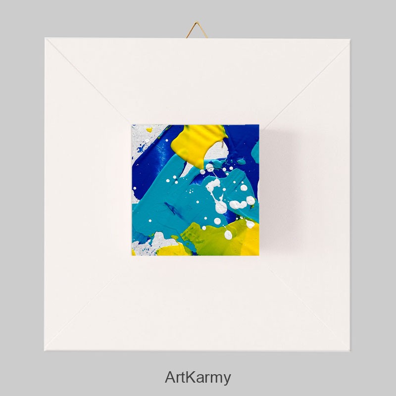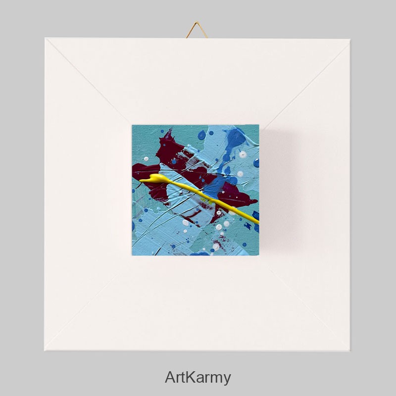 Realizzate su supporto in legno 5 x 5 cm, racchiuse in una cornice bianca in legno dipinta a mano, raggiungono una dimensione totale di 12 x 12 cm. I quadretti sono realizzati con la tecnica mista astratto materica.