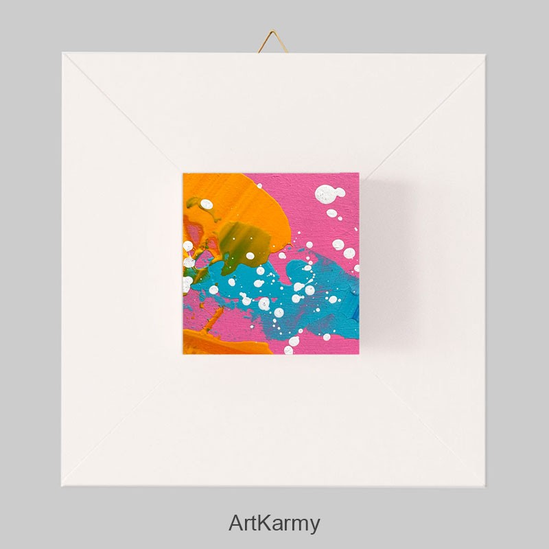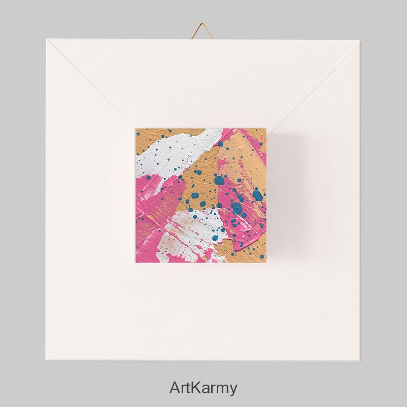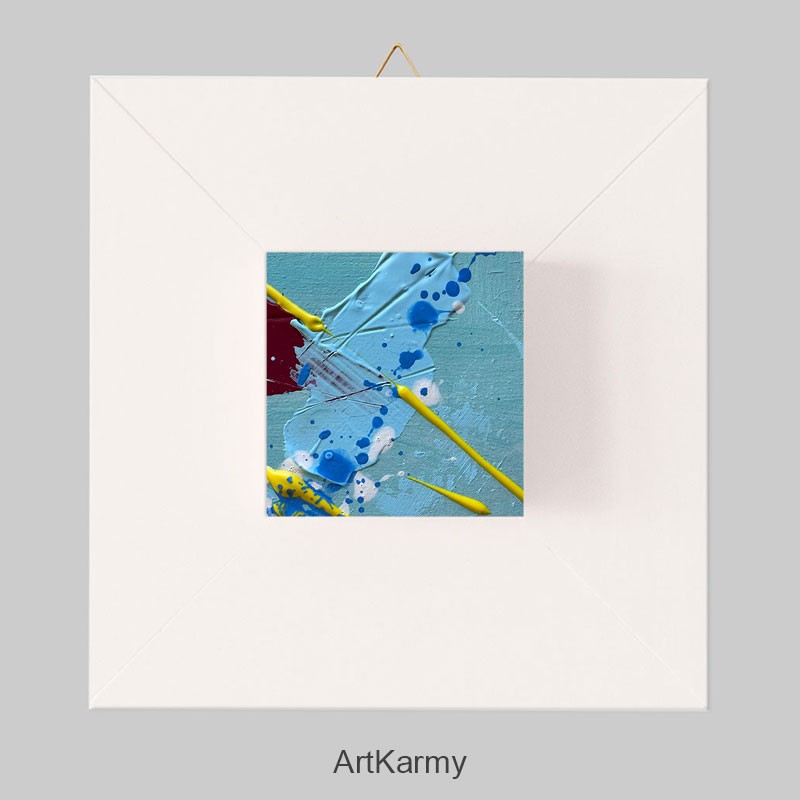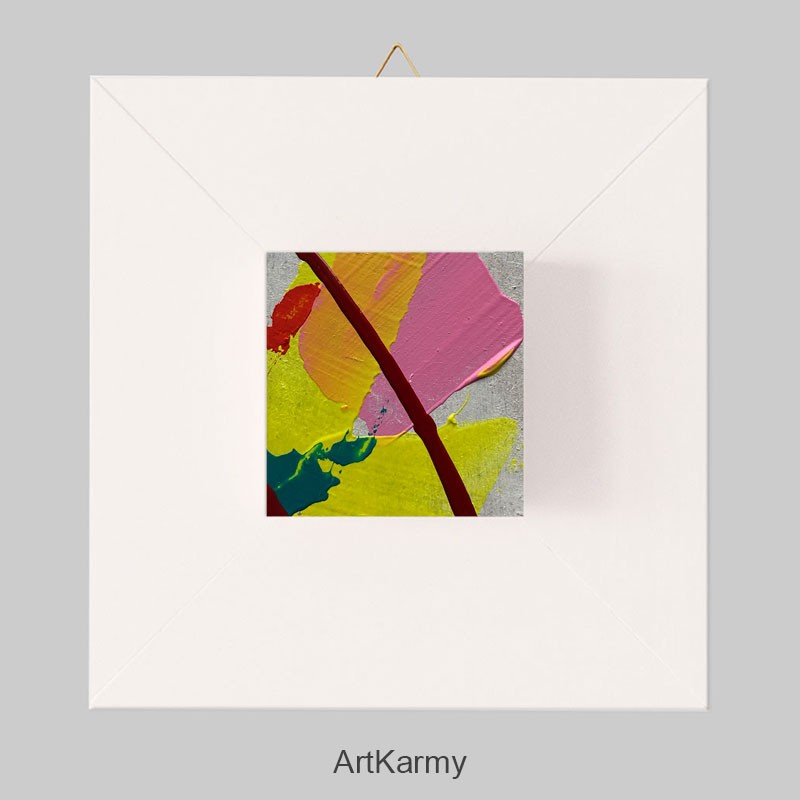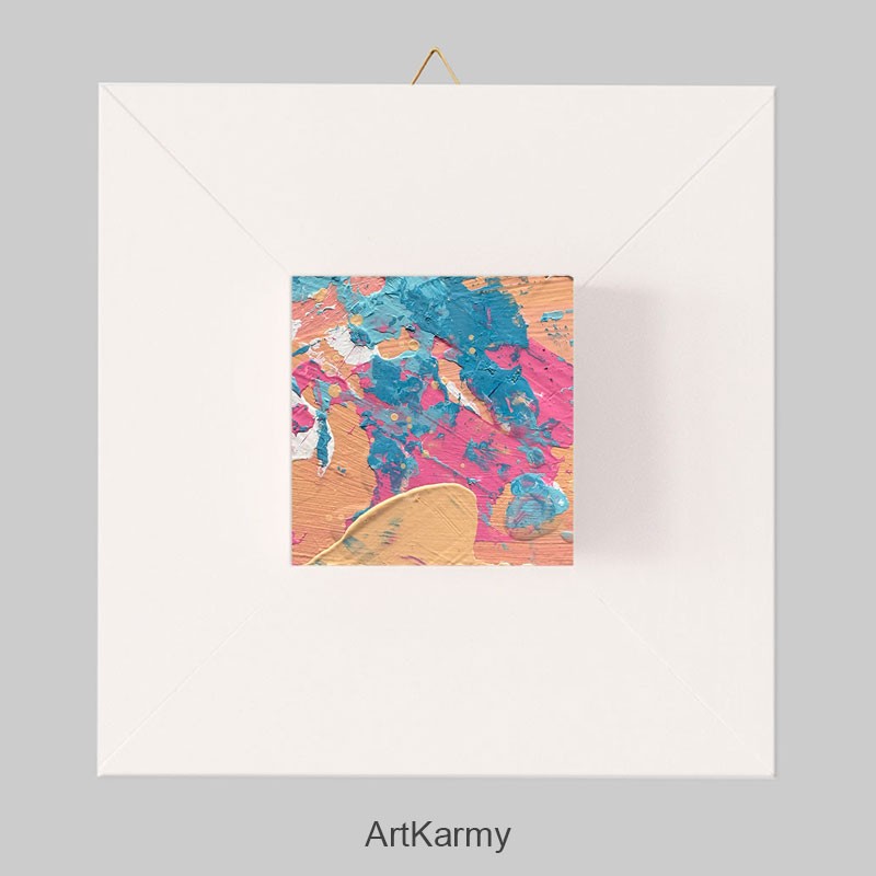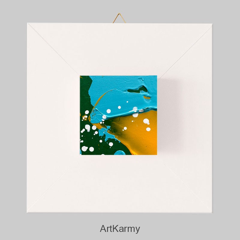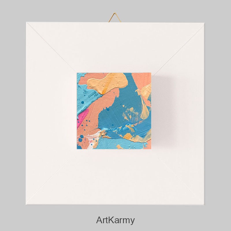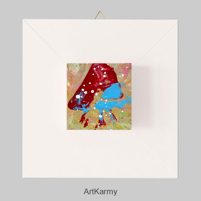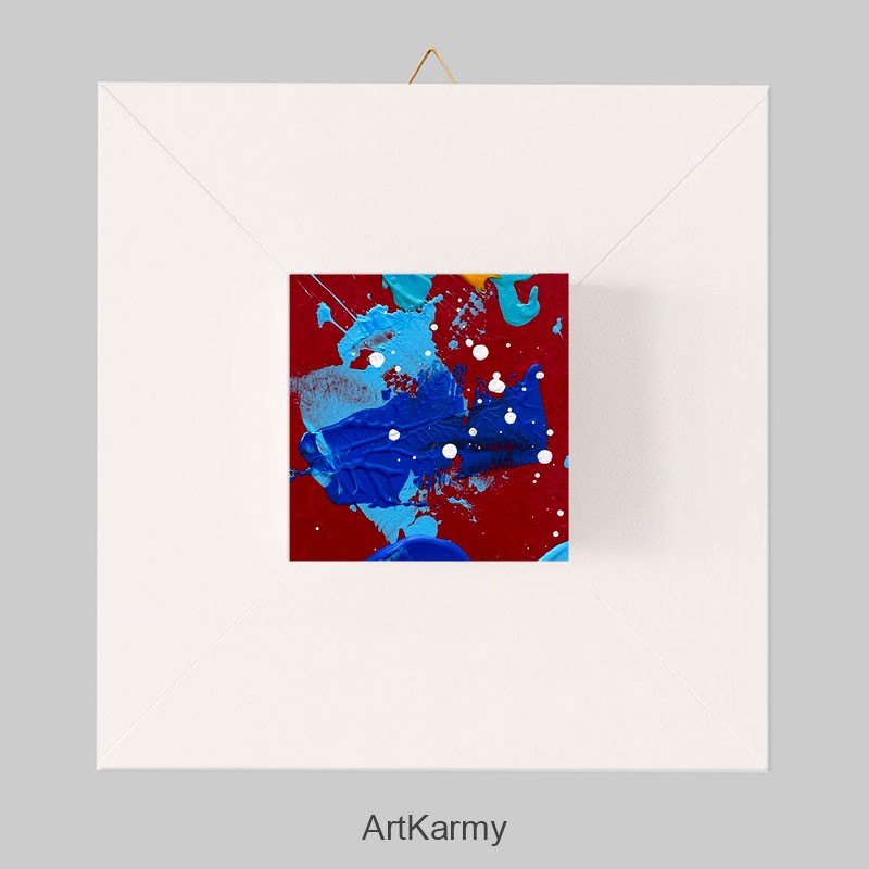 Realizzate su supporto in legno 5 x 5 cm, racchiuse in una cornice bianca in legno dipinta a mano, raggiungono una dimensione totale di 12 x 12 cm. I quadretti sono realizzati con la tecnica mista astratto materica.