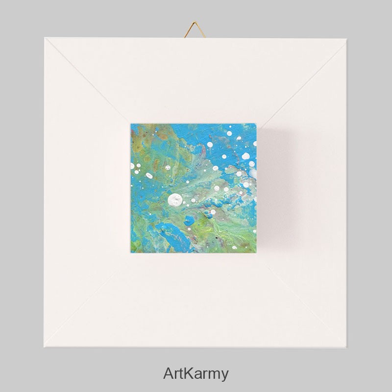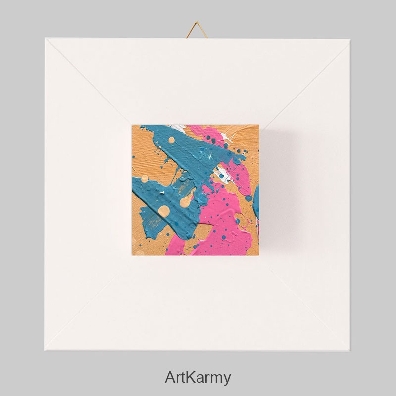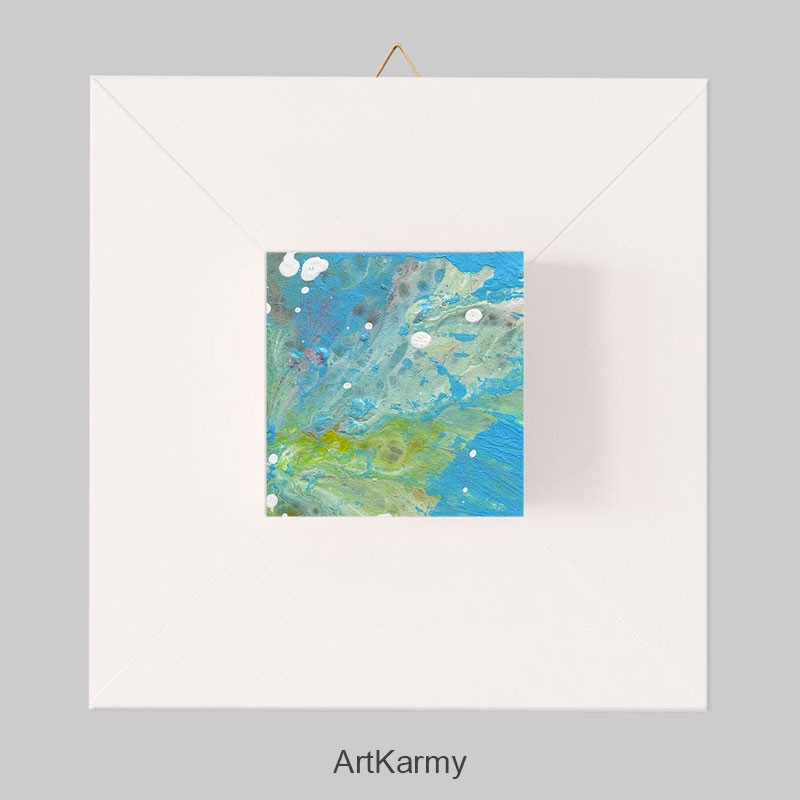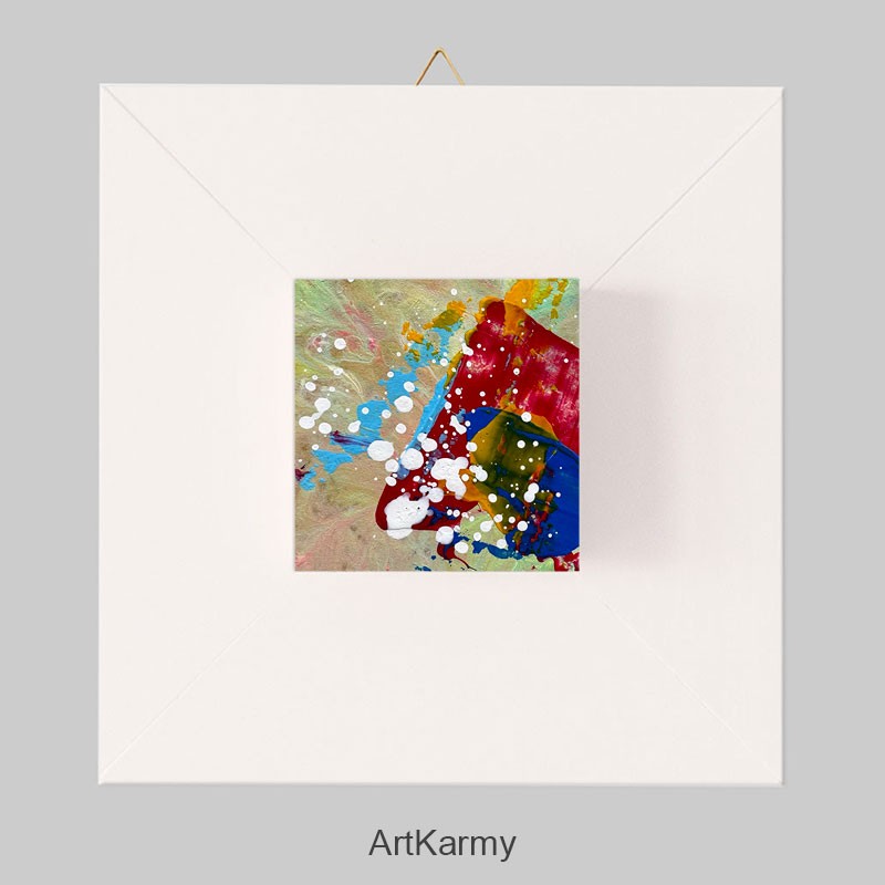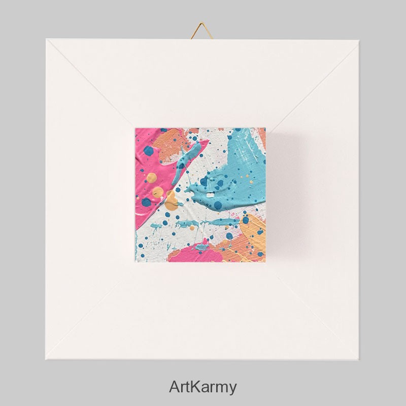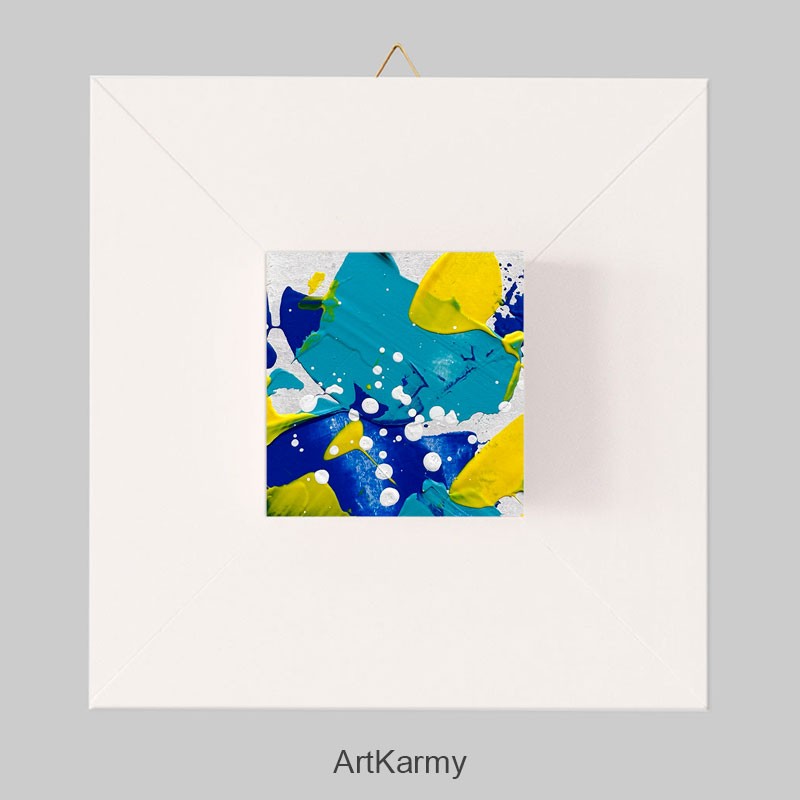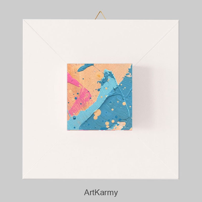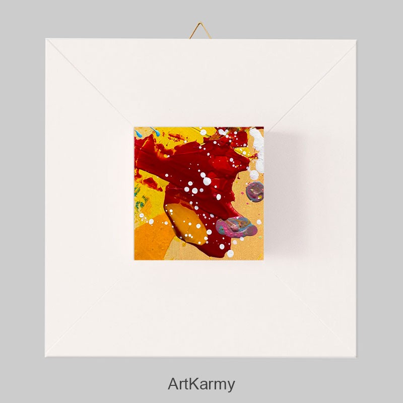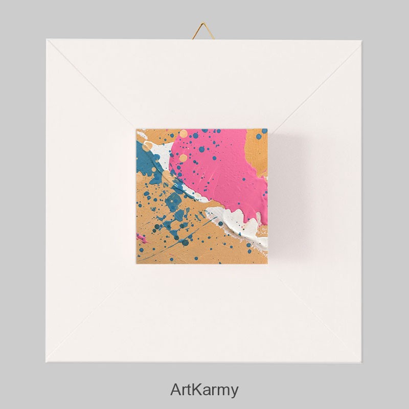 Realizzate su supporto in legno 5 x 5 cm, racchiuse in una cornice bianca in legno dipinta a mano, raggiungono una dimensione totale di 12 x 12 cm. I quadretti sono realizzati con la tecnica mista astratto materica.