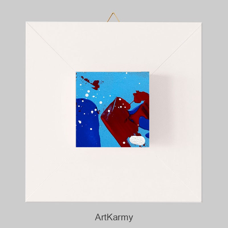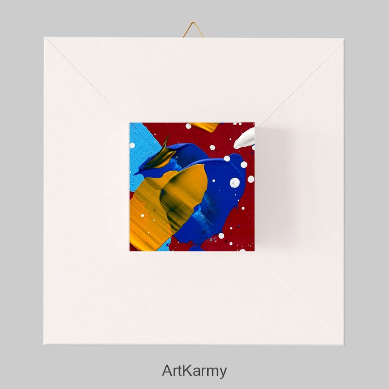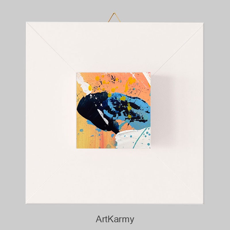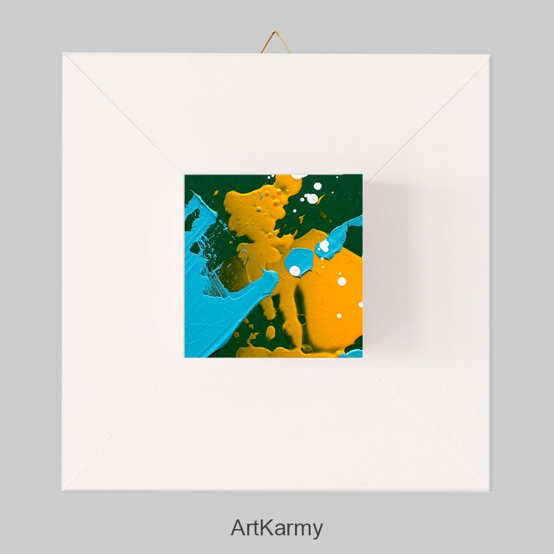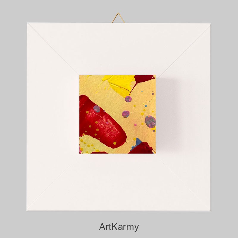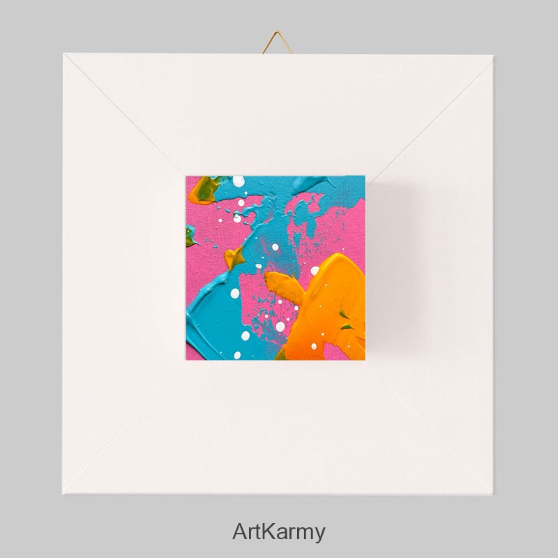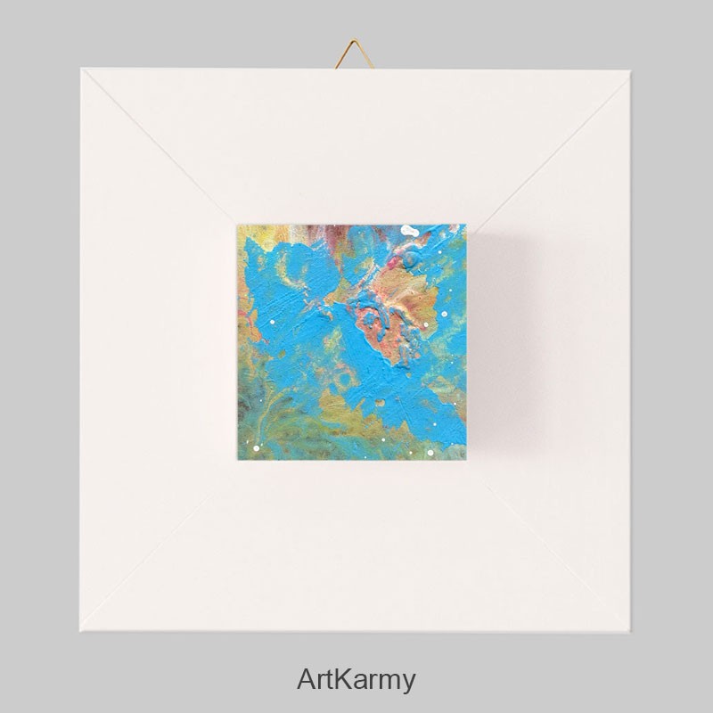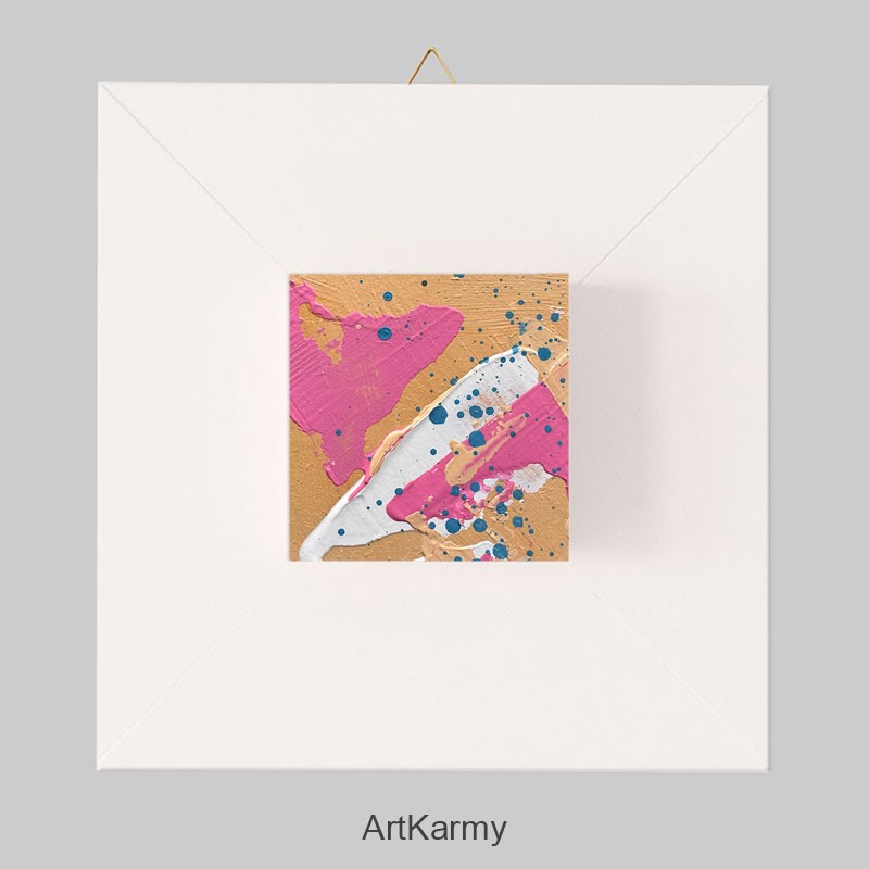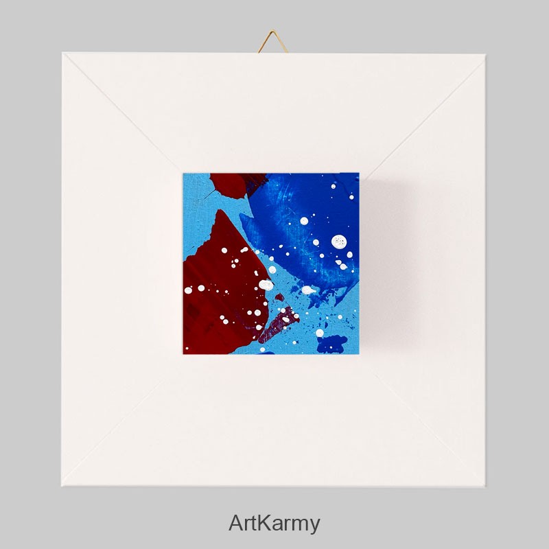 Realizzate su supporto in legno 5 x 5 cm, racchiuse in una cornice bianca in legno dipinta a mano, raggiungono una dimensione totale di 12 x 12 cm. I quadretti sono realizzati con la tecnica mista astratto materica.
