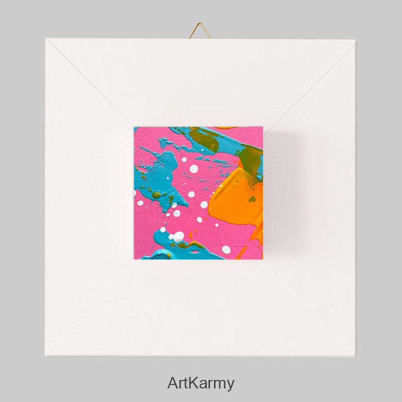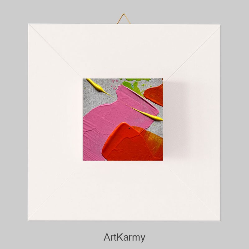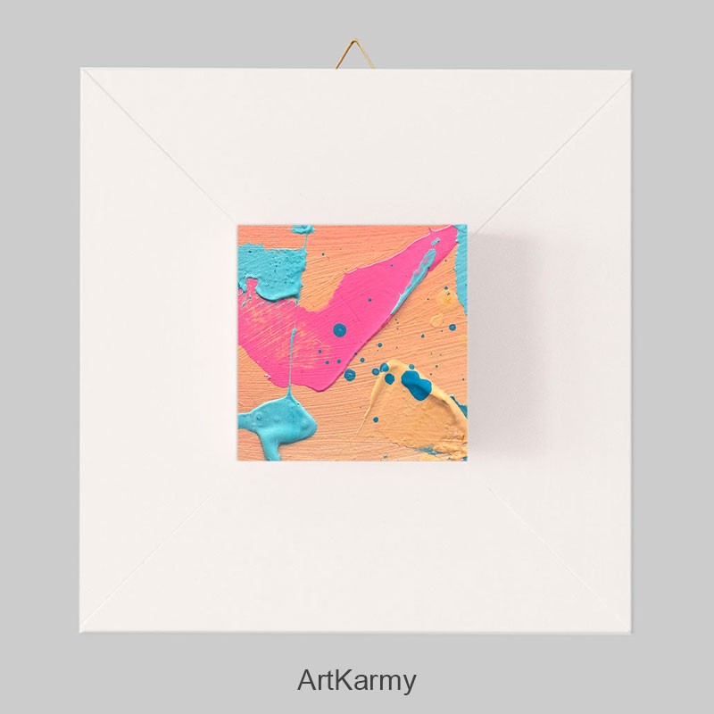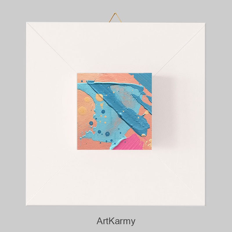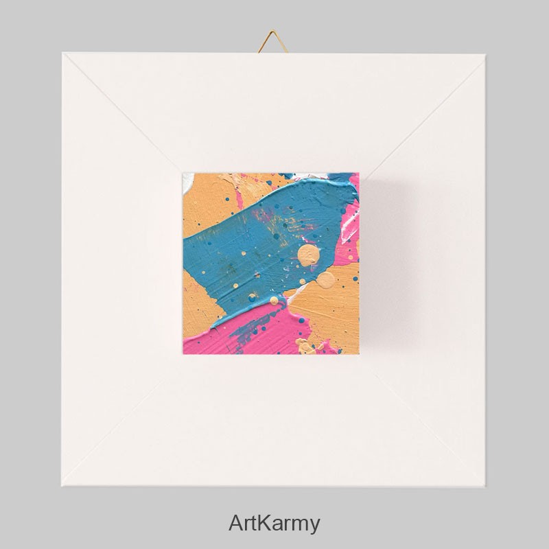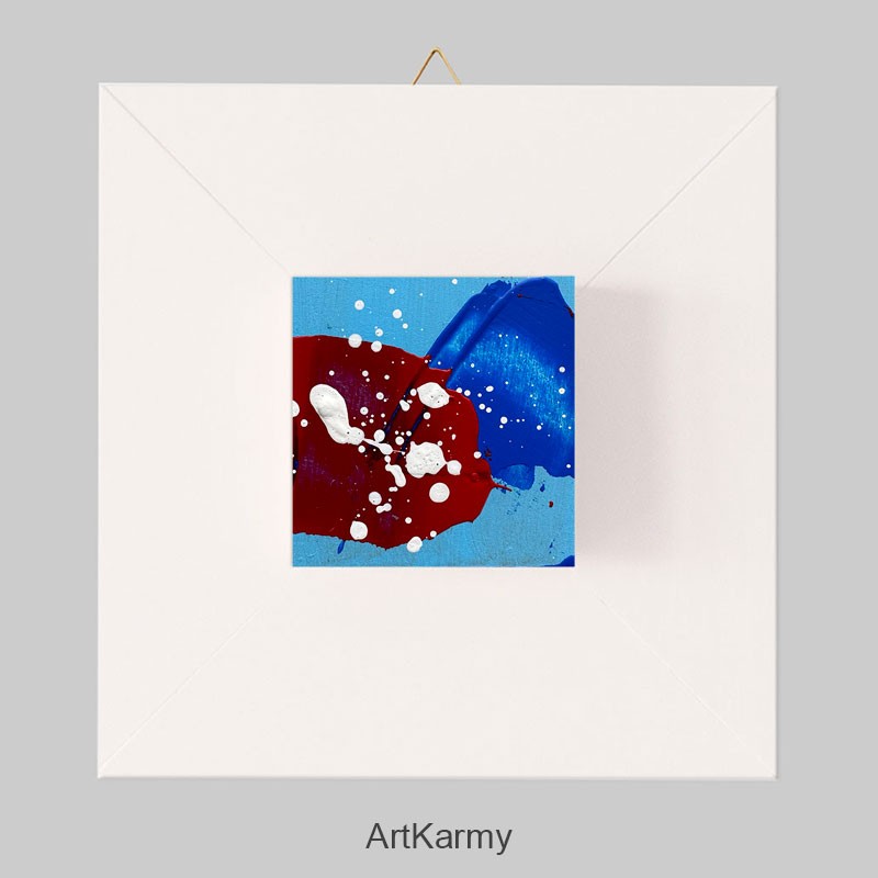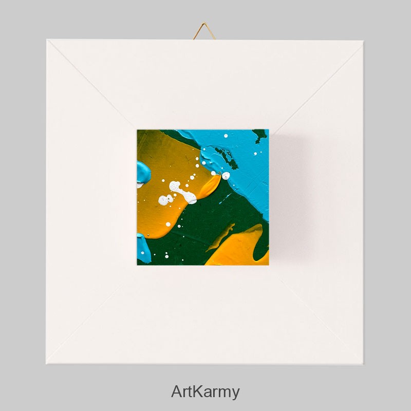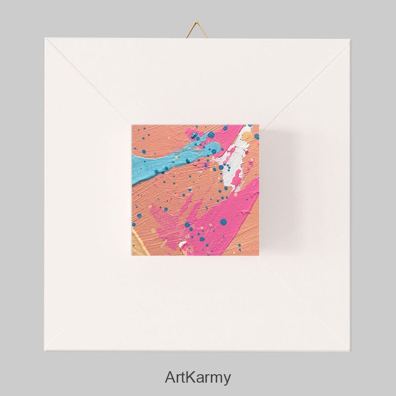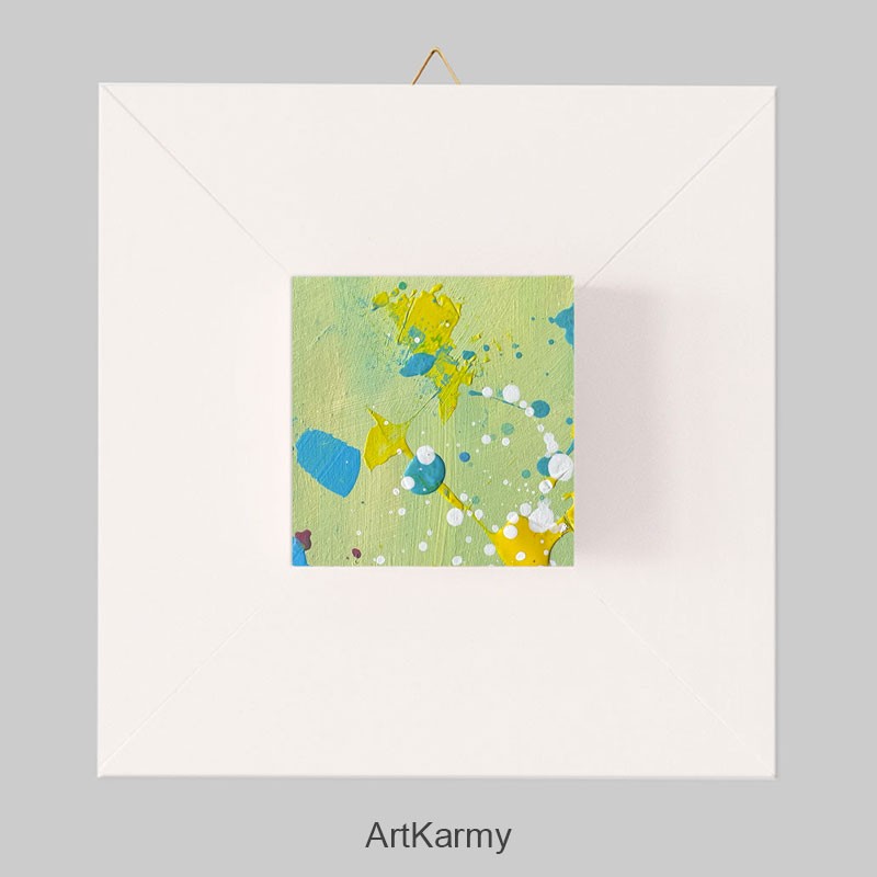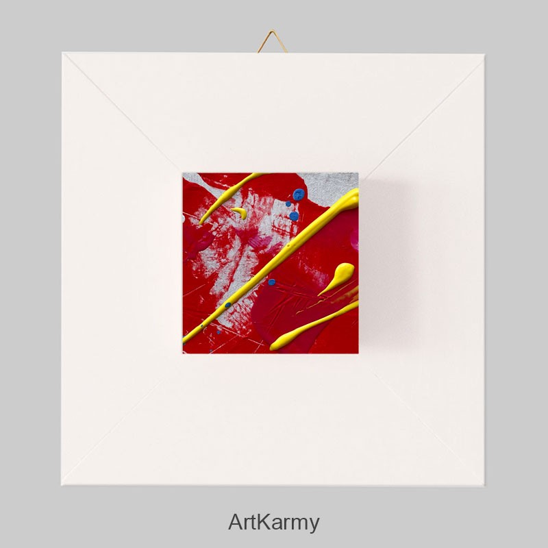 Realizzate su supporto in legno 5 x 5 cm, racchiuse in una cornice bianca in legno dipinta a mano, raggiungono una dimensione totale di 12 x 12 cm. I quadretti sono realizzati con la tecnica mista astratto materica.