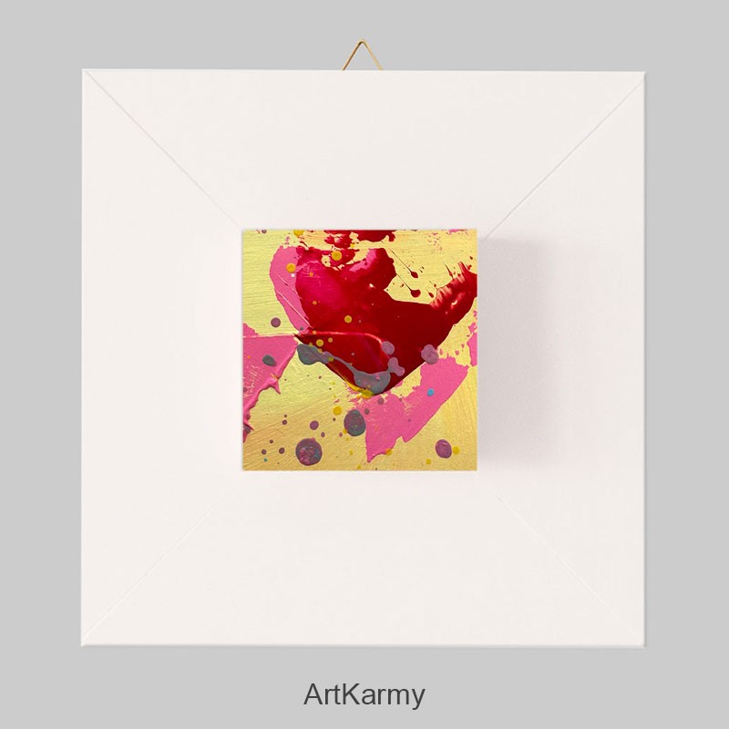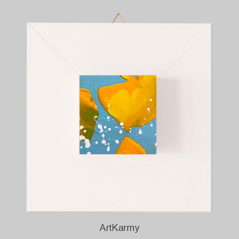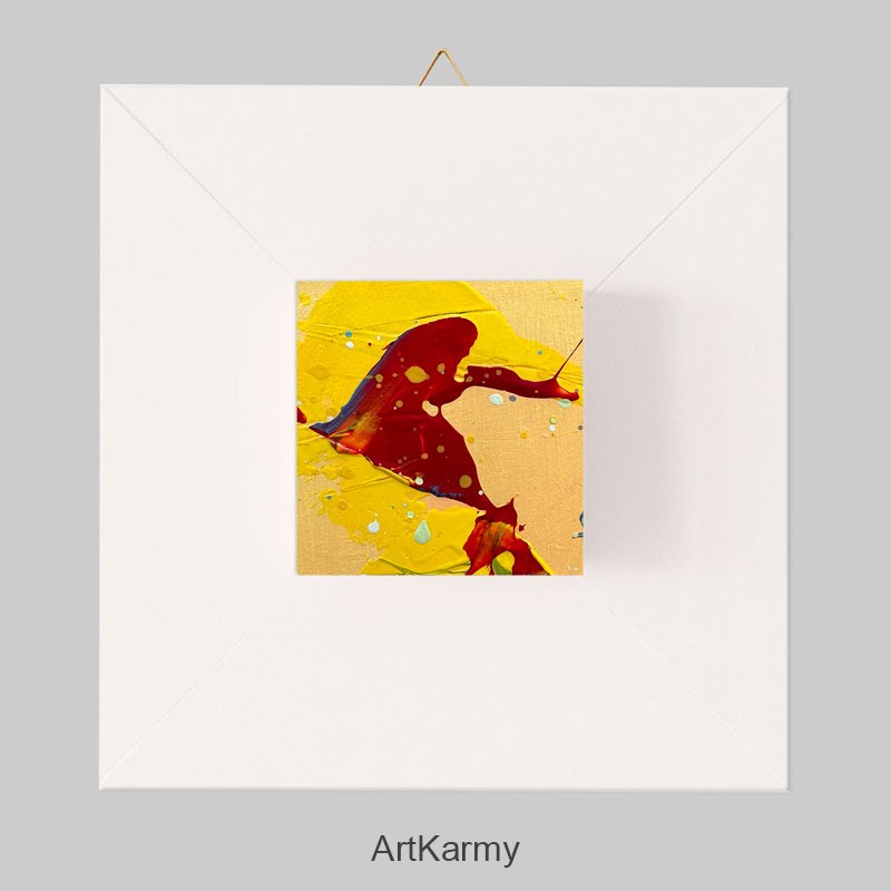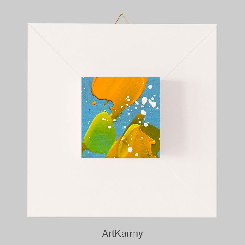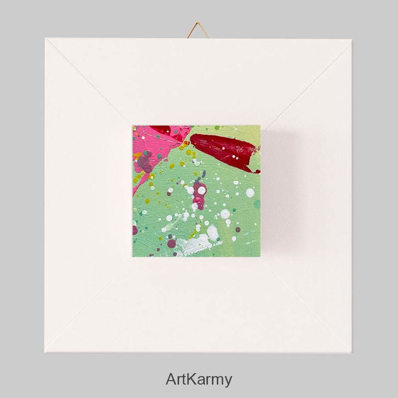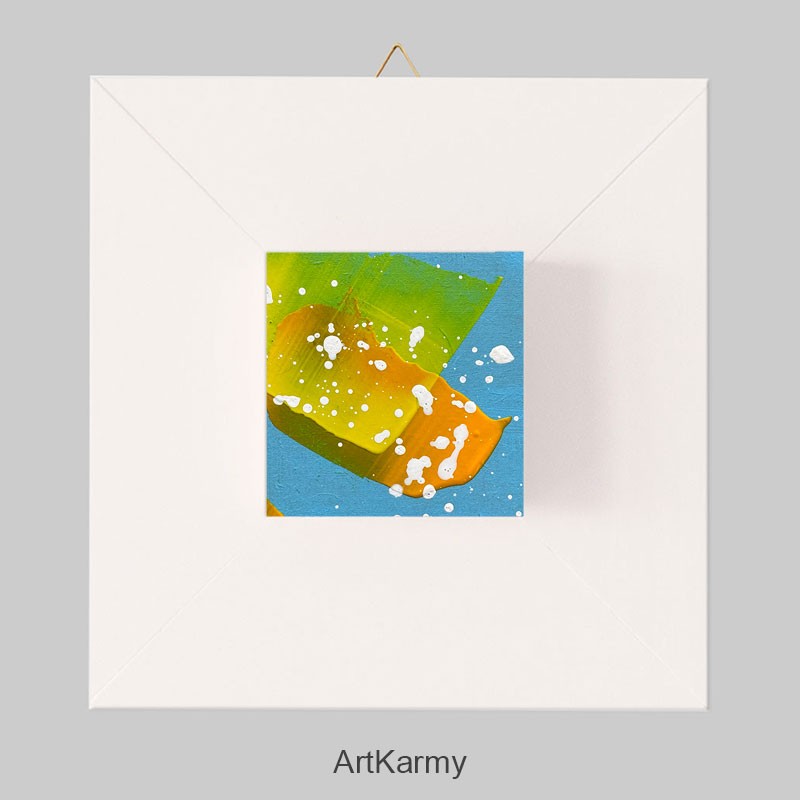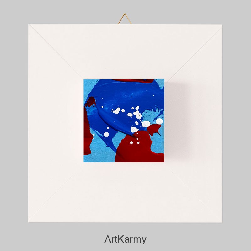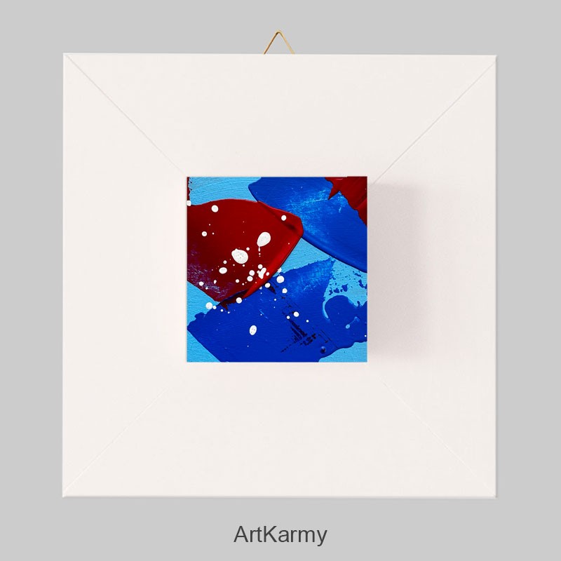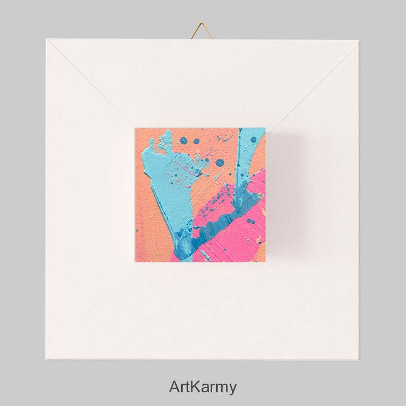 Realizzate su supporto in legno 5 x 5 cm, racchiuse in una cornice bianca in legno dipinta a mano, raggiungono una dimensione totale di 12 x 12 cm. I quadretti sono realizzati con la tecnica mista astratto materica.