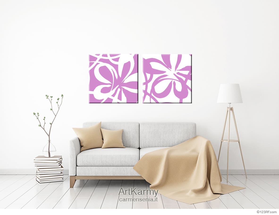Questa coppia di dipinti dal titolo Fiori astratti è disponibile nelle seguenti misure: 50×50 cm, 70×70 cm, 80×80 cm, 100×100 cm. Altri formati personalizzati su misura è possibile richiederli per adattattarli perfettamente ai vostri spazi.