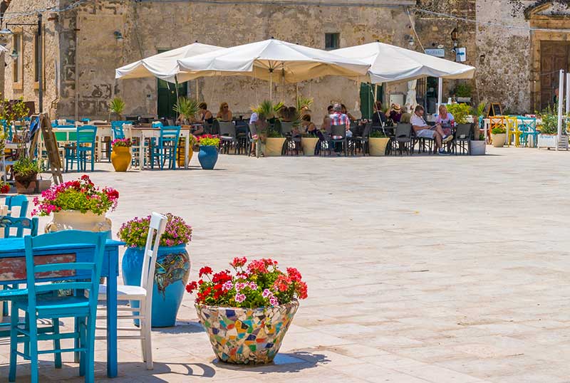 Particolare della bellissima Piazzetta di Marzamemi (SR) abbellita con vasi colorati e fiori, la rendono la piazzetta più instagrammata d’Italia